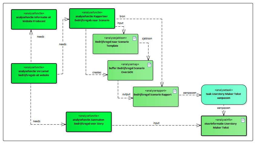 De analysefunctie Rapporteer Bedrijfsregels naar Scenario zorgt voor het vullen van het sjabloon. Daartoe wordt een overzicht gemaakt van de bedrijfsregels die het patroon Producent heeft aangemaakt. Deze informatie wordt omgezet tot een voorstel voor het scenario met behulp van het Bedrijfsregel naar Scenario Template.