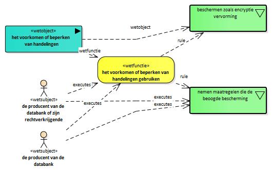 Het onderliggende algoritme loopt langs meerdere paden. In een beleidsregel is opgenomen dat de wetfunctie moet worden opgenomen in een bedrijfsregel op basis het nemen van een maatregel. Door de koppeling met het wetobject voorkomen of beperken dat in de wettelijke tekst in combinatie voorkomt met beschermen zoals encryptie wordt de andere bedrijfsregel aangemaakt.