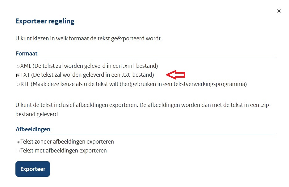De Analist wettekst kiest het juiste formaat en start het downloaden van de website wetten overheid